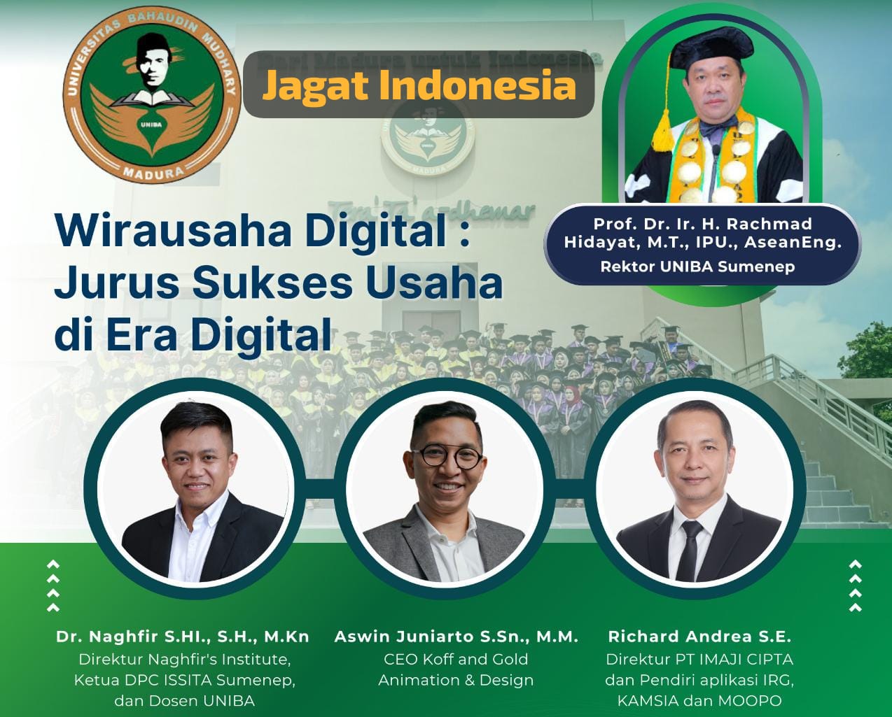 Sehingga dengan menarik kesimpulan dan pandangan dalam beberapa hal. Yang juga menarik perhatian maka Universitas Bahaudin Mudhary Madura (UNIBA Sumenep) bersama Naghfir’s Institute berinisiatif untuk mengadakan Seminar bertajuk Wirausaha Digital Jurus Sukses Usaha di Era Digital.