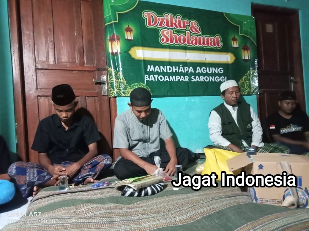 SARONGGI, JAGAT INDONESIA, 4 November 2025 – Komunitas Pemuda Pecinta Sholawat (KOMPAS) yang bernaung di bawah payung DNS (Dibawah Naungan Sholawat) sukses menggelar acara “Berdzikir & Bersholawat” dalam rangka mempererat tali silaturahim di Mandhapa Agung Batoampar, Kecamatan Saronggi. Kegiatan keagamaan yang berlangsung pada Malam Rabu Legi, 4 November 2025, bertepatan dengan 14 Jumadil Awal 1447 H, ini dihadiri oleh anggota komunitas dan masyarakat pecinta sholawat.