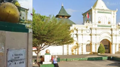 Di halaman luar Masjid Jamik Sumenep, berdiri monumen kecil berbentuk bola emas di atas tugu….